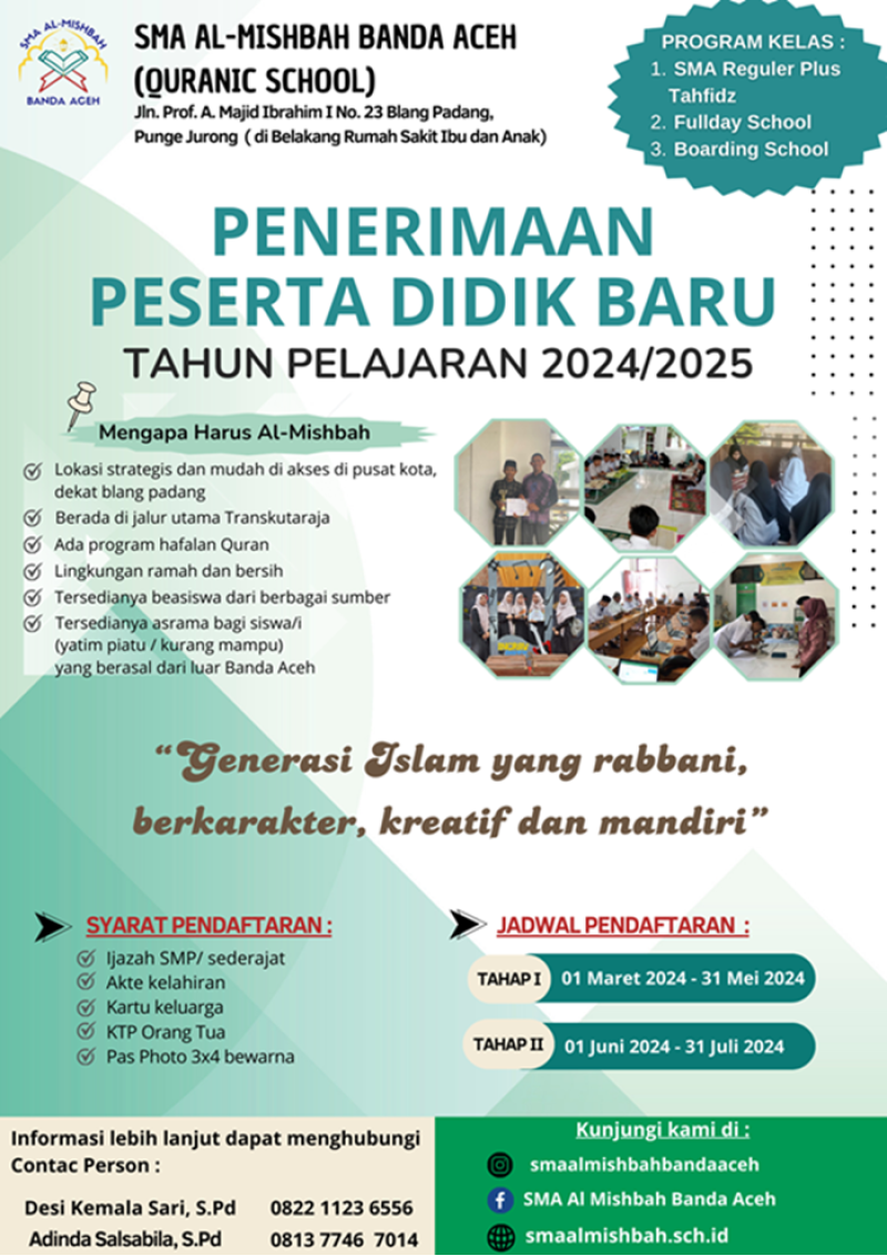 SMA Al-Mishbah Banda Aceh kembali membuka pendaftaran siswa baru tahun pelajaran 2024/2025.